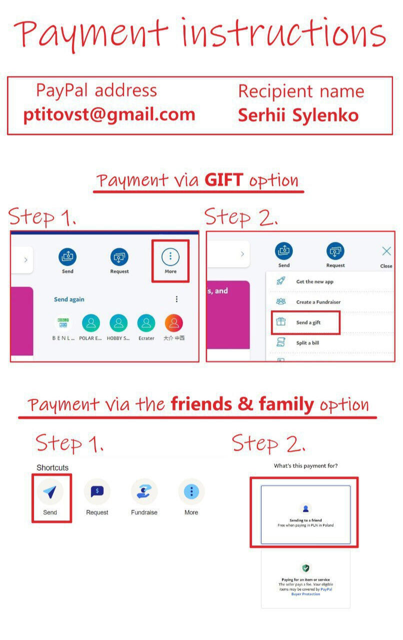 Payment for the commission is made through my intermediary on PayPal via "gift" option or "friends & family" option.Be careful, because if the payment is sent as a "payment for a service", then I will have to make a refund so that you make the payment again through the options described below.- To send using the "gift" option, please select "More" and "Send Gift" in your PayPal.- To send using the "friends and family" option, please select "Send" and "Sending to a friend" in your PayPal.For both options, a small commission will be charged, if this confuses you, then please select the amount that will give you the desired total.Leave a comment blank or write something like "donation in support of art"Send payment only in $USD.Upon completion of the payment, send a screenshot of the successful transaction to the dialog with me so that we do not have to wait for confirmation from my paypal intermediary.Paypal address: [email protected]
